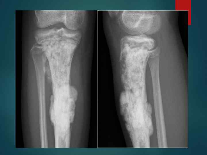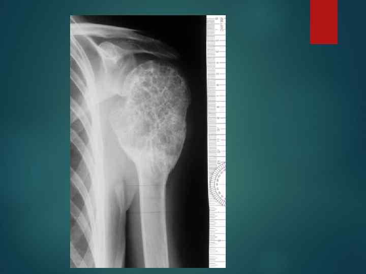 Диагностика Рентгенологический метод является важнейшей составной частью комплексного Рентгеносемиотика зависит от нозологической формы опухоли, темпов роста, анатомической области. Наиболее часто определяются очаги деструкции с характерным лизисом, признаки патологического костеобразования, различные виды периостальных реакций Рентгенологическое определение очага опухоли в костной ткани возможно при уменьшении содержания кальция на 30 % и более.