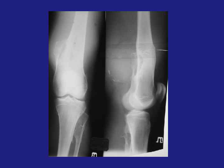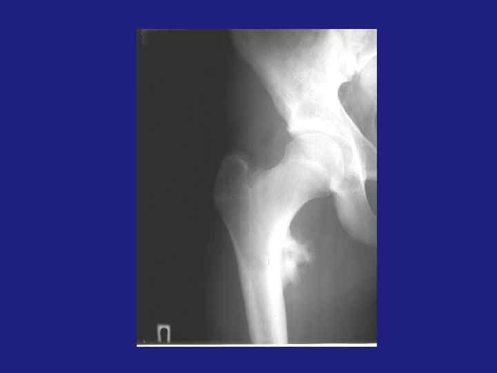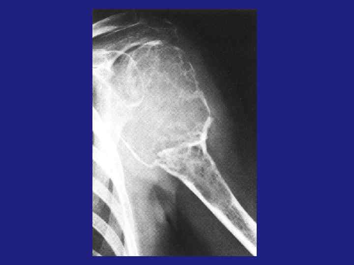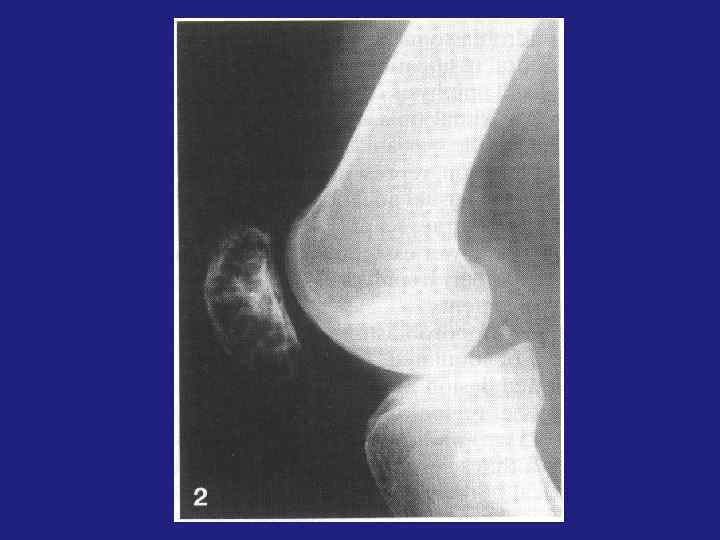 Остоегенная саркома остеолитическая и остоебластическая. üЛокализация зона активного роста – метафиз, метадиафиз длинных трубчатых костей. Изолированно диафиз не поражается. Через хрящ не переходит. üКозырек Кодмена – реактивный периостит. Спикулообразный периостит – костеобразование по ходу стенок кровеносных сосудов, проникающих в кость.