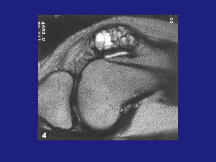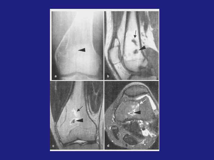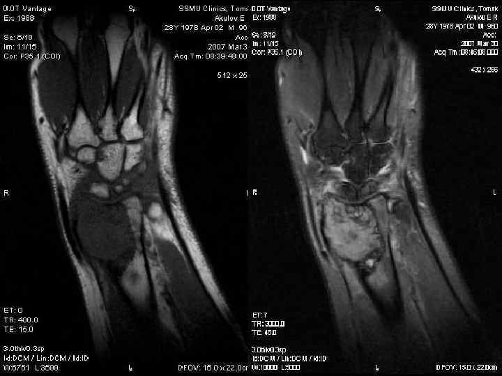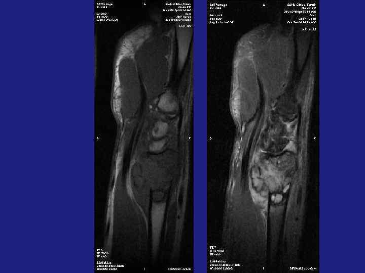 Остеоид-остеома. МРТ-» Гнездо» опухоли в Т 1 ВИ– низкоинтенсивынй сигнал, в Т 2 ВИ-высокоинтенсивынй сигнал. Реактивный остеосклероз в Т 1 Ви и в Т 2 ВИ – низкоинтенсивный сигнал. При обызвествлении «гнезда» опухоли – сложно дифференцировать опухоль от реактивного склероза. После контрастного усиления- повышение сигнала в «гнезде» опухоли в Т 1 ВИ.