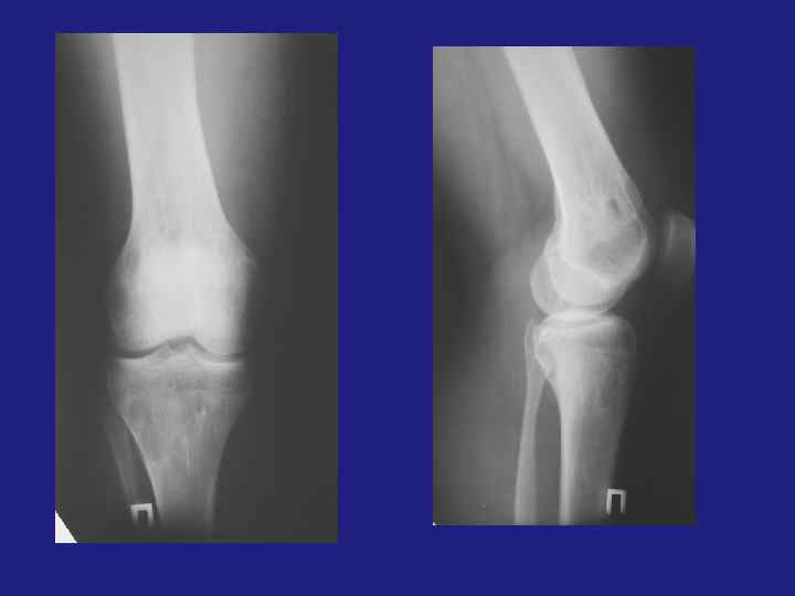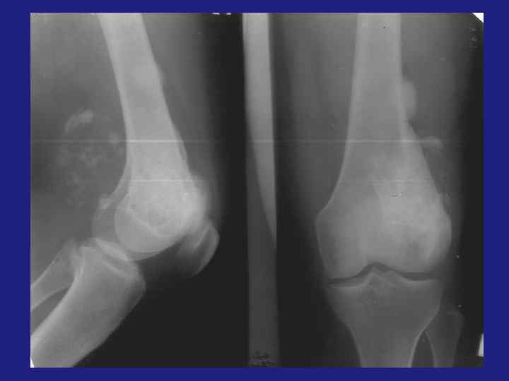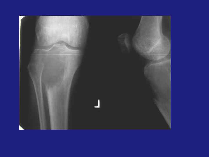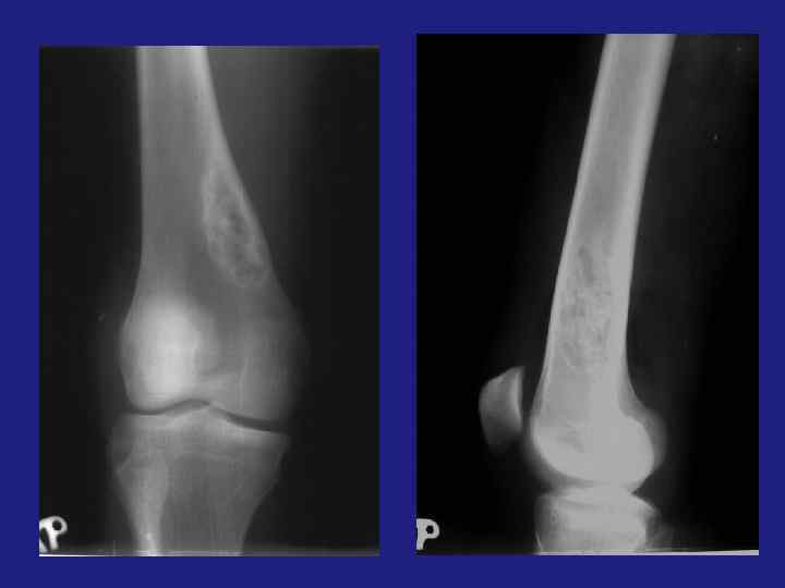 Внутрикостная липома ü 0, 1 -2, 5% всех костных опухолей. üЛокализация – губчатое вещество, трубчатые кости – метафиз, губчатые кости. üЭксцентрическое просветление, хорошо отграниченное от окружающих тканей, возможны включения. üДифференцировать - с фиброзной дисплазией, аневризматической кистой, хрящевыми опухолями.
