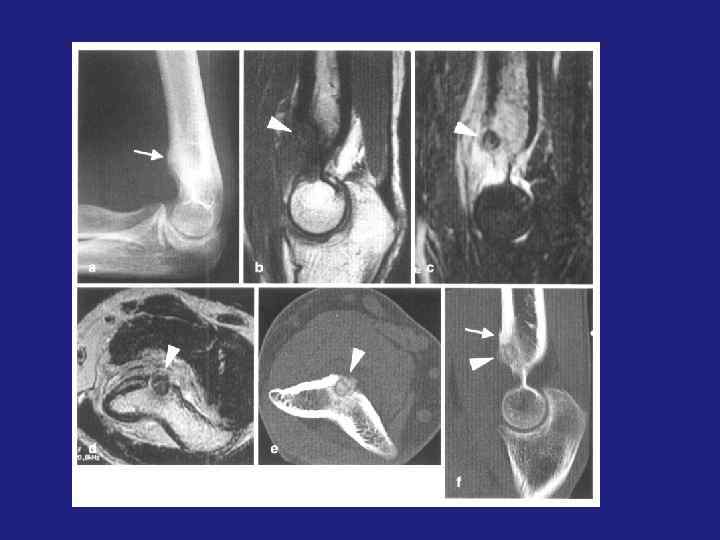 Хондромиксоидная фиброма. Образуется из хрящевой, фиброзной ткани и мукоидной субстанции Локализация – длинные трубчатые кости, преимущественно метафизы. Редко – изолированно в диафизе и эпифизах. Редко – губчатые и плоские кости. Рентгенография. Просветление округлой или овальной формы с четким выпуклым наружным контуром. В Возможно резкое истончение кортикального слоя. Возможны точечные обызвествления и септальные линии. КТ- низкоплотное образование МРТ – промежуточный сигнал в Т 1 ВИ, вариабельный (преимущественно высокий ) сигнал в Т 2 ВИ. Постконтрастное усиление сигнала в Т 1 ВИ.