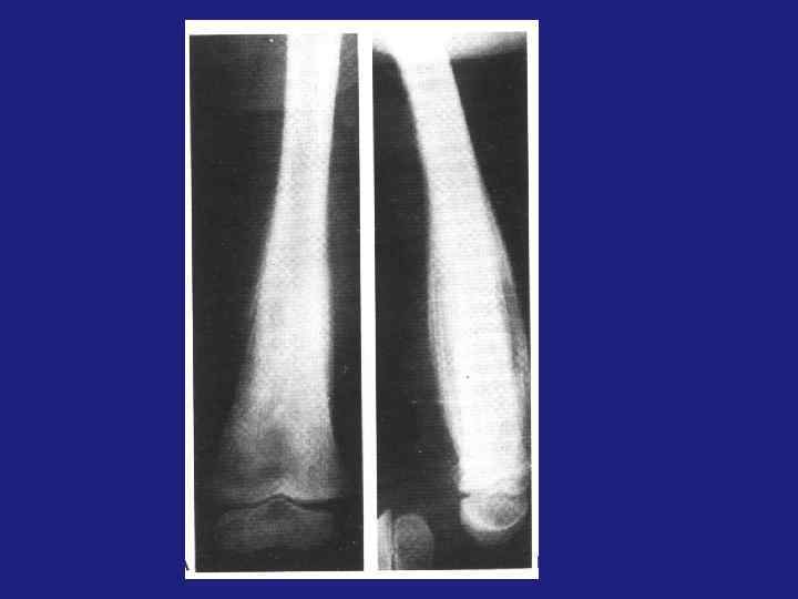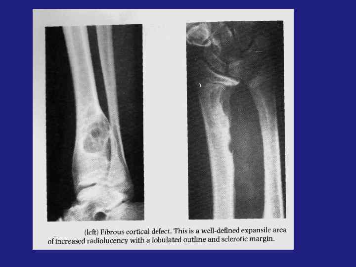 üФиброзная дисплазия подразделяется на фиброзный кортикальный дефект, фиброзную дисплазию, не оссифицированную фиброму кости. üФиброзный кортикальный дефект – результат инвазии соединительной ткани надкостницы в подлежащую кость. üЛокализация - метафиз и метадиафиз длинных трубчатых костей. Отдельные плоские кости. Бессимптомный очаг «фиброзной» (просветление) ткани в пределах кортикального слоя кости, 2 -4 см. Ориентирован параллельно длиннику кости. Наружный контур ровный, волнистый. üНе оссифицированная фиброма – если очаг начинает увеличиваться и расти эксцентрично (это по Резнику) üЕсли центрально – фиброзная дисплазия. üФиброзная дисплазия-более крупный участок просветления, овальной формы, с четкой пограничной склеротической каймой. Может иметь фестончатый контур. üДифференциальный диагноз неоссифицированной фибромы – остеобластокластома, костная киста, фиброзная дисплазия. üКостная киста возникает в детстве, локализация – эпифиз, в центре.