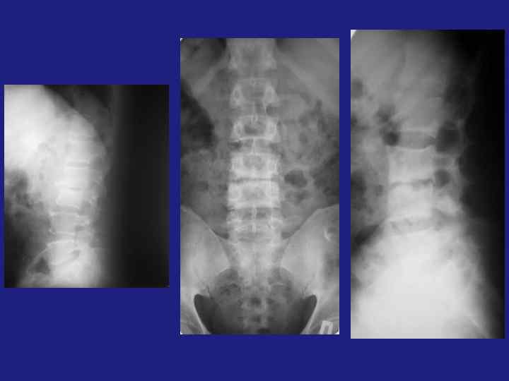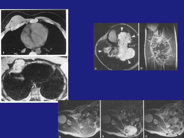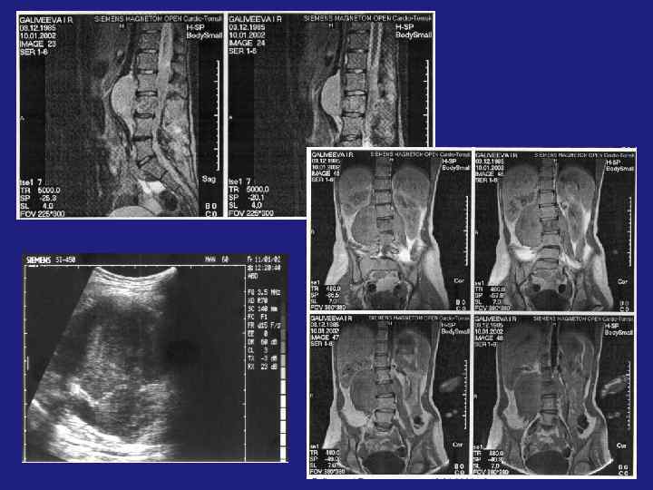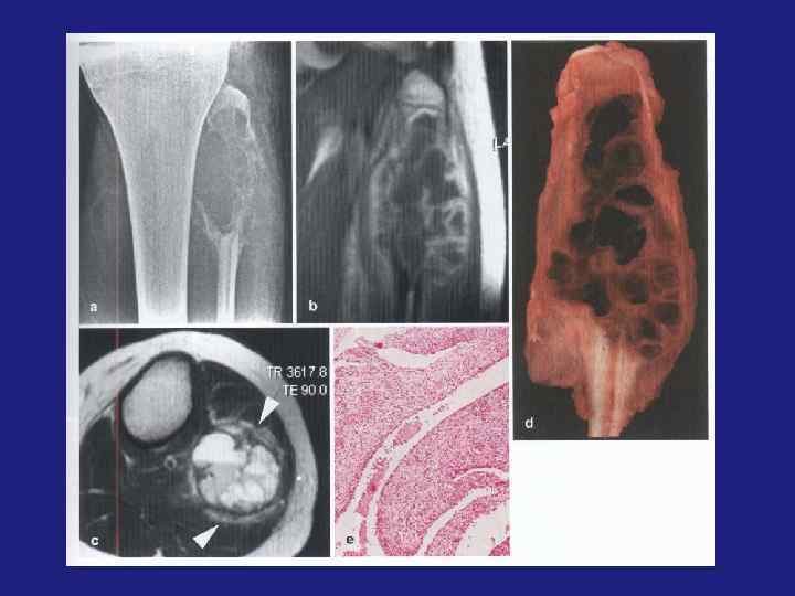 Методы исследования: - Рентгенография - Компьютерная томография – кортикальная деструкция, патологический перелом, оценка степени минерализации опухоли, постконтрастное повышение плотности (больше 20 -70 HU) -МРТ –– Т 1 ВИ– низкий сигнал, Т 2 ВИ– низкий и гетерогенный сигнал (низкий - за счет гемосидерина и фиброзной ткани, высокий – за счет метгемоглобина и жидкости, ассоциированной с аневризматической кистой - Сцинтиграфия – для исключения полиоссального поражения, определения активности роста. Формы (Волков): - Пассивно –кистозные ; Активно-кистозные; Литические