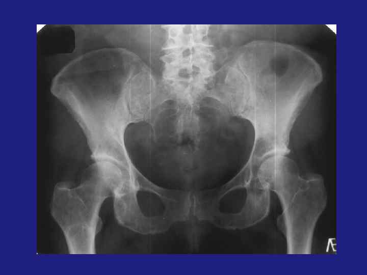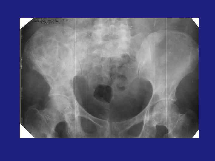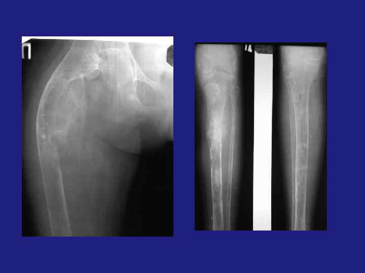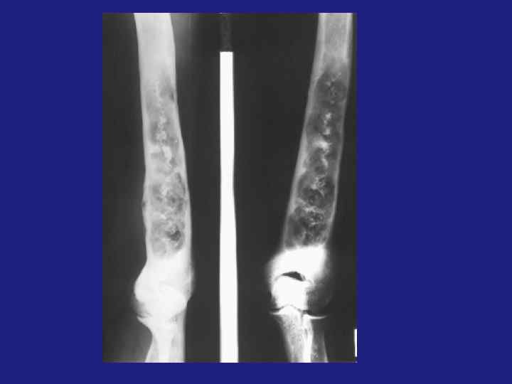 üФиброзная дисплазия подразделяется на фиброзный корковый дефект, фиброзную дисплазию, не оссифицированную фиброму кости. üФиброзный корковый дефект – метафиз и диафиз. Бессимптомный очаг «фиброзной» ткани в пределах кости, 3*4 см. üНе оссифицированная фиброма – если очаг начинает увеличиваться и расти эксцентрично (это по Резнику) üЕсли центрально – фиброзная дисплазия. üФиброзная дисплазия-более крупный участок просветления, овальной формы, с четкой пограничной склеротической каймой. Может иметь фестончатый контур. üДифференциальный диагноз неоссифицированной фибромы – остеобластокластома, костная киста, фиброзная дисплазия. üКостная киста возникает в детстве, локализация – эпифиз, в центре. üОстеобластокластома – локализация зависит от возраста, рост эксцентричный. üОкончательный диагноз - микроскопический.