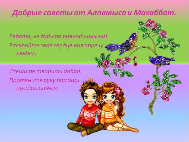 Добрые советы от Алпамыса и Махаббат. Ребята, не будьте равнодушными! Раскройте своё сердце навстречу людям. Спешите творить добро. Протяните руку помощи нуждающимся.