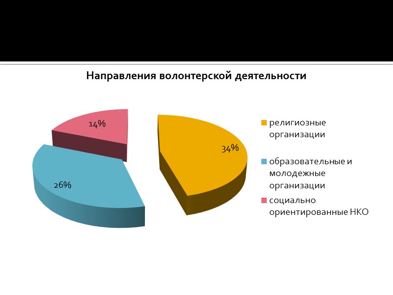 Характеристики российского добровольческого движения Российские добровольцы, в отличие от добровольцев других стран, работают только в некоммерческих организациях - благотворительных, экологических, правозащитных и других. Исследование Института проблем гражданского общества. Всего было обследовано 1500 общественных организаций из 52 российских регионов. Направления их деятельности охватывают практически все основные области жизнедеятельности (социальная сфера, образование, культура, экология, безопасность, здравоохранение и др.).