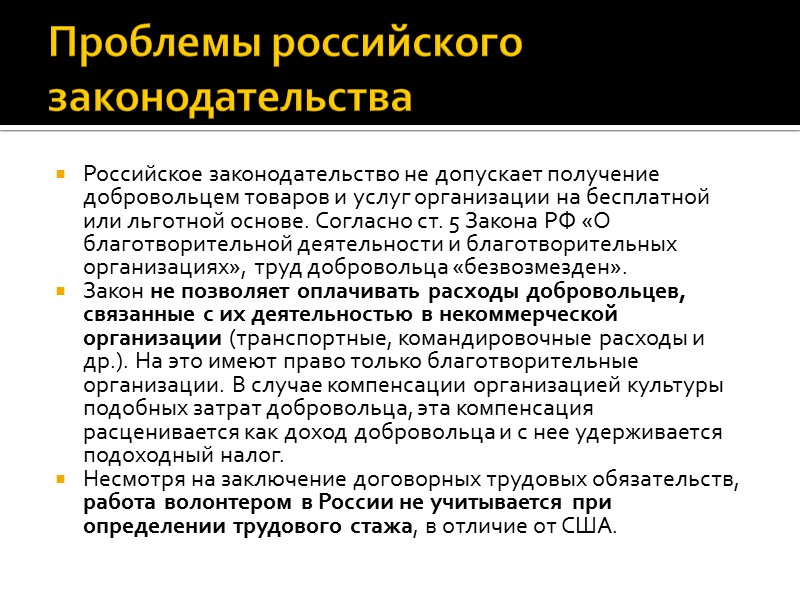 Проблемы российского законодательства Российское законодательство не допускает получение добровольцем товаров и услуг организации на бесплатной или льготной основе. Согласно ст. 5 Закона РФ «О благотворительной деятельности и благотворительных организациях», труд добровольца «безвозмезден». Закон не позволяет оплачивать расходы добровольцев, связанные с их деятельностью в некоммерческой организации (транспортные, командировочные расходы и др.). На это имеют право только благотворительные организации. В случае компенсации организацией культуры подобных затрат добровольца, эта компенсация расценивается как доход добровольца и с нее удерживается подоходный налог. Несмотря на заключение договорных трудовых обязательств, работа волонтером в России не учитывается при определении трудового стажа, в отличие от США.