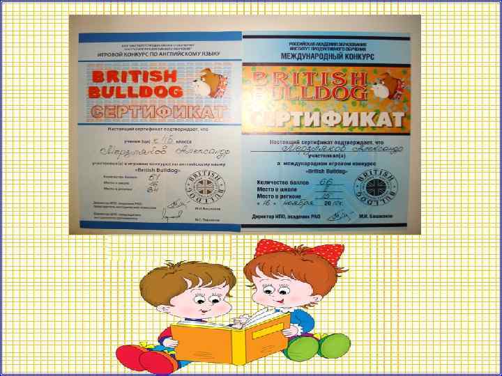 А также участвую в олимпиадах и конкурсах № Класс 1 место 3 «б» Дата участия Название май 2011 г. Уровень Занятое место, участие Баллы Подпись кл. руководителя Международный математический конкурс "Кенгуру" 3 47 2 3 «б» Bulldog" ноябрь 2011 г. 2 место 66 Международный конкурс по английскому языку "British 3 4 «б» Bulldog" март 2012 г. 16 место 51 Международный конкурс по английскому языку "British
