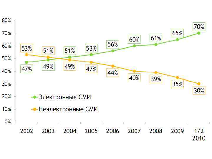 Историческая справка Развитие профессиональной интернет-рекламы в России • 1996 - появилась первая оплаченная реклама на русскоязычных сайтах (пионерам – сайтам simplex и Сов. Инфо. Бюро – за этот революционный шаг досталось 113, 17 и 98, 44 долларов соответственно). • 1998 - в России уже активно осуществляется продвижение сайтов в национальной доменной зоне • 2001 -2002 - были запущены основные службы контекстной рекламы – Яндекс. Директ, «Бегун» Рамблера и русскоязычный Ad. Words от Google. • 2005 - Экспертам известно, что устойчивый интерес к рекламному носителю возникает в тот момент, когда он способен охватить не менее 12 -15% населения – и летом свершилось знаковое для развития рекламы в Рунете событие: порог был перейден, и Интернетом стали регулярно пользоваться более 14% россиян.