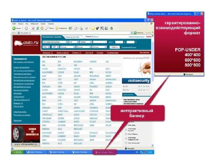Pop-Up – баннер, открывающийся в новом окне над страницей сайта. Pop-Under – баннер, открывающийся в новом окне под страницей сайта (другое название backscreen). Этот вид баннеров характеризуется высокими показателями эффективности рекламной кампании Pop-Under максимально фокусирует на себе внимание и обеспечивает рекламный контакт в тот момент, когда посетитель сайта не отвлекается на другую информацию. Pop-Under может быть активирован без закрытия сайта щелчком мыши в панели задач, тогда баннер просто отбразится поверх сайта. Посетитель сайта может кликнуть по баннеру и перейти на сайт рекламодателя, может свернуть или закрыть баннер.
