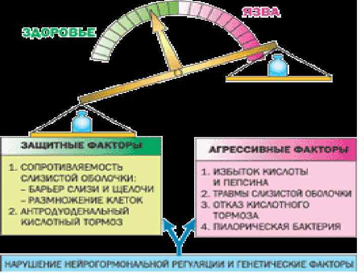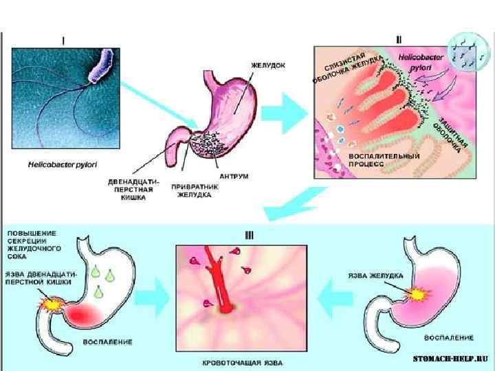 • Геликобактер Пилори (Helicobacter pylori). Геликобактер нарушает защитные функции слизистой, которая перестает нормально сопротивляться агрессивной среде желудка. Инфицирование геликобактерией чрезвычайно распространено — 20% населения до 30 лет и 50% населения старше 60 лет инфицированы. К счастью, инфекция не всегда приводит к развитию язвы. Заражение геликобактерией происходит при прямом контакте (напр. , поцелуях), через пищу и воду.