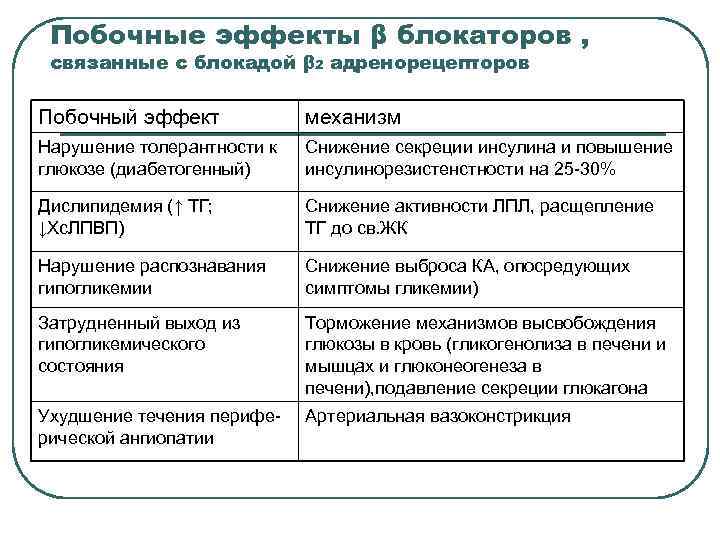 Побочные эффекты β блокаторов , связанные с блокадой β 2 адренорецепторов Побочный эффект механизм Нарушение толерантности к Снижение секреции инсулина и повышение глюкозе (диабетогенный) инсулинорезистенстности на 25 -30% Дислипидемия (↑ ТГ; Снижение активности ЛПЛ, расщепление ↓Хс. ЛПВП) ТГ до св. ЖК Нарушение распознавания Снижение выброса КА, опосредующих гипогликемии симптомы гликемии) Затрудненный выход из Торможение механизмов высвобождения гипогликемического глюкозы в кровь (гликогенолиза в печени и состояния мышцах и глюконеогенеза в печени), подавление секреции глюкагона Ухудшение течения перифе- Артериальная вазоконстрикция рической ангиопатии