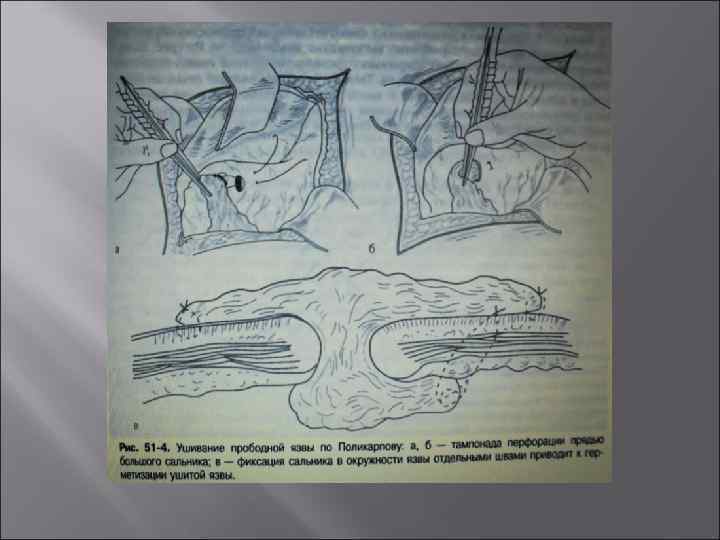 Методы ушивания: Метод М. И. Островского (швы накладывают через все слои стенки желудка поперечно к продольной оси органа. Поверх этажа швов накладывают серо-серозные швы, к которым фиксируют сальник на ножке); Метод Д. П. Чухриенко (сальник на ножке не подвязывают, а подшивают к окружности ушитой язвы); Метод И. И. Неймарка (заключается в наложении швов вдоль продольной оси желудка в пределах здоровых тканей со вколом и выколом на одной и другой стороне от язвы. Шов не должен проникать через слизистую оболочку в просвет желудка. Второй ряд швов не накладывается. По окружности язвы фиксируют сальник. Швы должны быть из капроновых или лавсановых нитей); Метод В. И. Оппеля - И. Н. Поликарпова (применяется при наличии большого инфильтрата вокруг язвы, в связи с опасностью прорезывания швов применяют; производится тампонада перфорации).