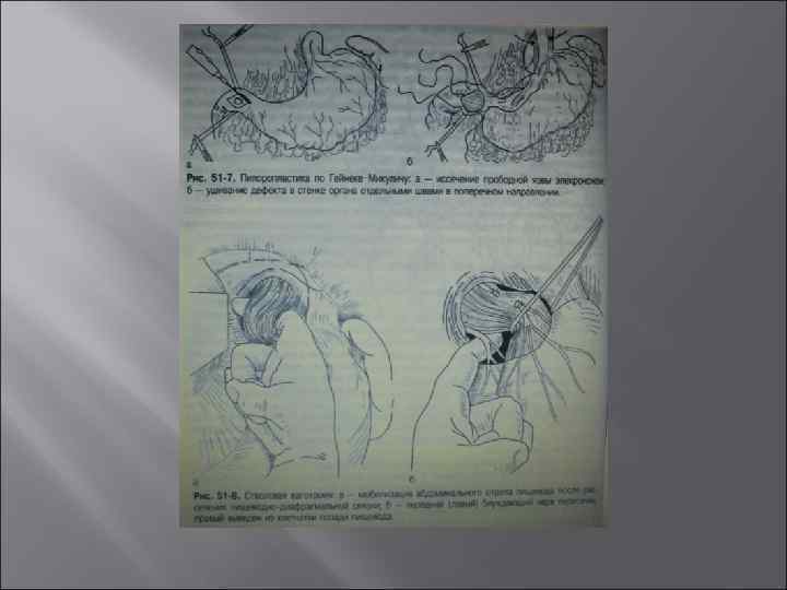 Ваготомия с иссечением перфоративной язвы и пилоропластикой Показана при локализации язвы на передней стенке луковицы двенадцатиперстной кишки или язве пилорического отдела желудка при отсутствии большого инфильтрата и резкой рубцовой деформации выходного отдела желудка. При экстренной операции предпочтение отдают стволовой ваготомии с пилоропластикой по Гейнеке. Микуличу.