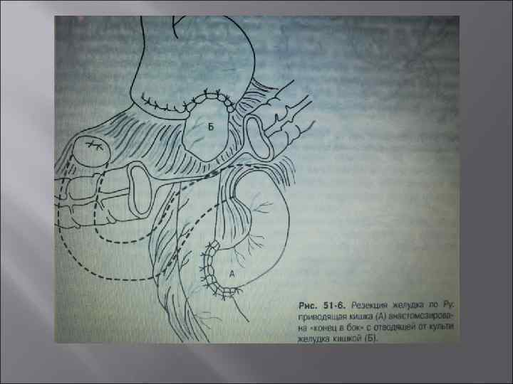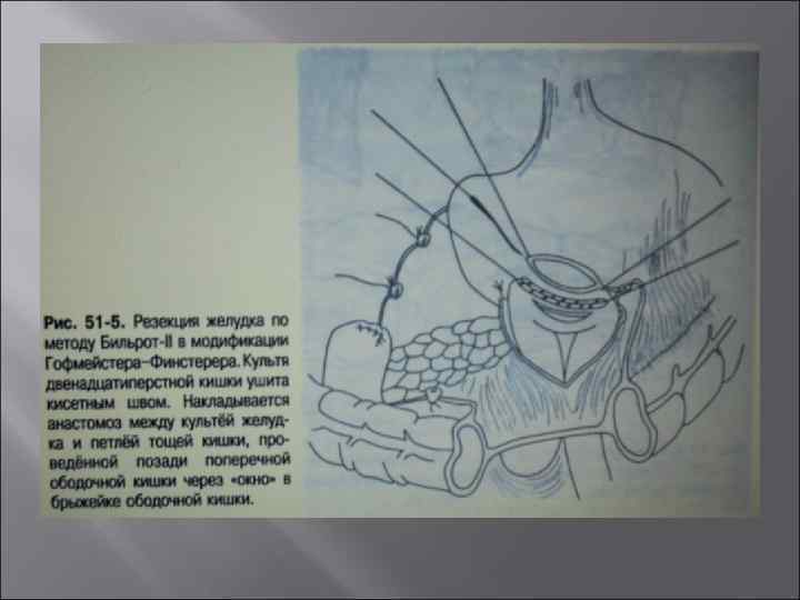 Резекция желудка (антрумэктомия) в сочетании со стволовой ваготомией Выполняют, когда обнаруживают перфорацию язвы 12 ПК и одновременно хроническую язву желудка. При обнаружении хронической язвы 12 ПК и перфорации язвы желудка. При наличии сочетания нескольких осложнений язвенной болезни. При пилородуоденальном стенозе III-IV степени. Резекцию проводят, как правило, по методу Бильрот – II в модификации Гофмейстера – Финстерера. При низких дуоденальных язвах, технических трудностях обработки культи 12 ПК целесообразно выполнение анастомоза по Ру.