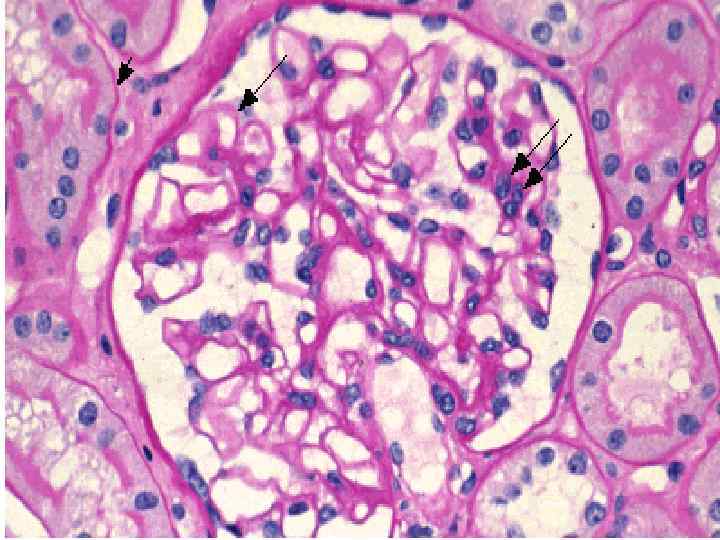 Гистологические изменения l Воспаление клубочков (инфильтрация клетками воспаления) l Пролиферация мезангиальных, эпителиальных или эндотелиальных клеток (очаговая, диффузная)
