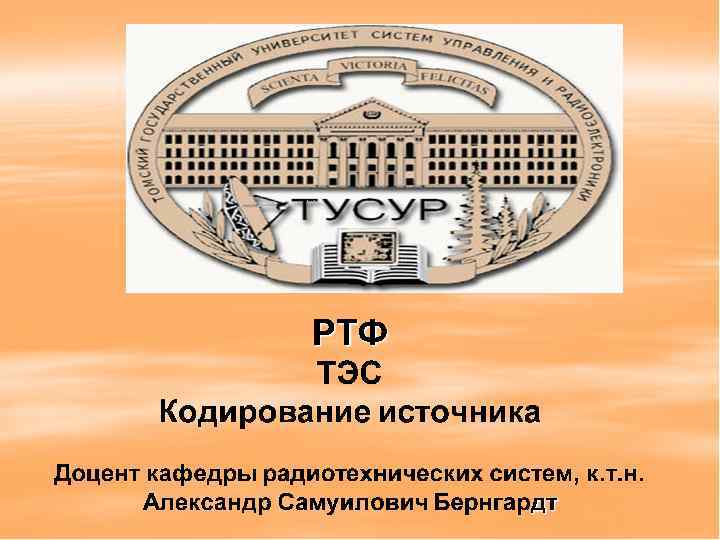 Доцент кафедры радиотехнических систем А. С. Бернгардт, Тусур, РТФ. КОДИРОВАНИЕ источника Согласование по избыточности имеет 2 аспекта. Во – первых, устранение нерегулярной (хаотической избыточности ), которой обладают сообщения большинства источников. Это задача эффективного кодирования (кодирование источника, сжатие информации). Во – вторых, введение регулярной избыточности, позволяющей приеме обнаруживать и даже исправлять ошибки. Это задача помехоустойчивого кодирования (кодирование канала).