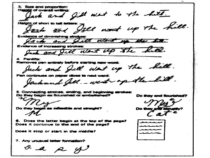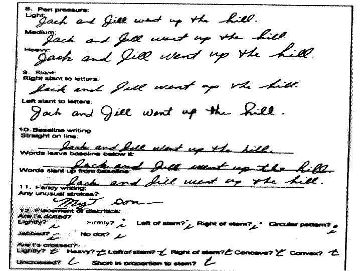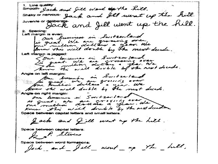Handwriting Traits • • Shapes of the letters and their slant, angles, connections, and curves The line quality, or the thickness of the line as a result of the type of writing instrument used and the pressure exerted while writing Spacing, alignment, formatting, and unique punctuation Spelling, phrasing, punctuation, and grammar
