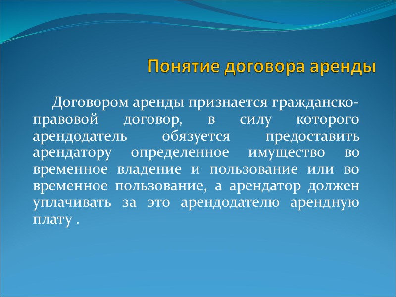 Понятие договора аренды Договором аренды признается гражданско-правовой договор, в силу которого арендодатель обязуется предоставить арендатору определенное имущество во временное владение и пользование или во временное пользование, а арендатор должен уплачивать за это арендодателю арендную плату .