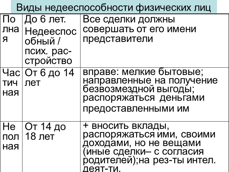 *Правоспособность - способность иметь гражданские права и нести обязанности: гражданина и юридического лица возникает с рождения Дееспособность - своими действиями приобретать и осуществлять их, создавать для себя гр. обязанности и исполнять их, в полном объеме с18л. Исключения: вступление в брак. Ст. 21. -Эмансипация (с 16 лет, если работает по трудовому договору или с согласия законных представителей занимается предприним. деятельностью по решению органа опеки и попечительства Ст.27 соответствует целям деятельности в учредительных документах. Ограничено в правах лишь в случаях, предусмотренных законом. Решение об ограничении прав может быть оспорено в суде. Возникает с создания и прекращается внесением записи о его исключении из ЕГРЮЛ. Право осуществлять деятельность, на занятие которой необходимо получение лицензии, возникает с момента её получения или в указанный в ней срок и прекращается по истечении срока её действия, если иное не предусмотрено правовыми актами.