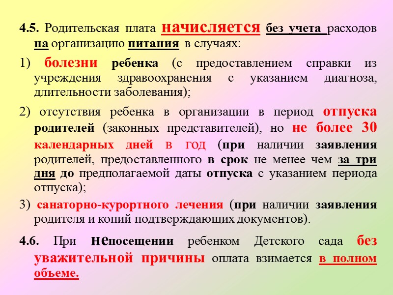 4.5. Родительская плата начисляется без учета расходов на организацию питания в случаях: 1) болезни ребенка (с предоставлением справки из учреждения здравоохранения с указанием диагноза, длительности заболевания); 2) отсутствия ребенка в организации в период отпуска родителей (законных представителей), но не более 30 календарных дней в год (при наличии заявления родителей, предоставленного в срок не менее чем за три дня до предполагаемой даты отпуска с указанием периода отпуска); 3) санаторно-курортного лечения (при наличии заявления родителя и копий подтверждающих документов). 4.6. При непосещении ребенком Детского сада без уважительной причины оплата взимается в полном объеме.
