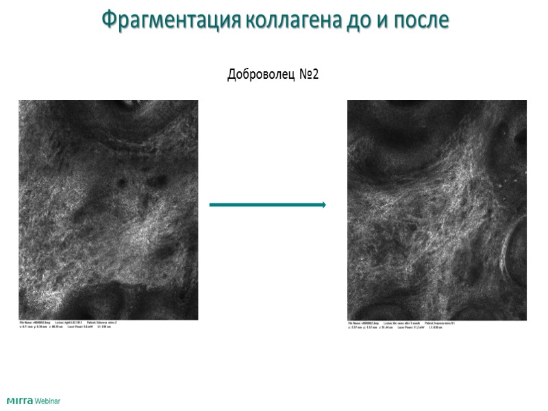 Показатель фрагментации волокон сосочкового слоя дермы Степень фрагментации коллагена, оцениваемая с помощью программы Confoscan 1.0.4 (OrionTechnoLab, France), дает нам информацию об организации коллаген\эластиновой сети сосочковом слое дермы. Выраженность уровня фрагментации соотносится с выраженностью степени эластоза в верхних слоях дермы. С возрастом степень эластоза увеличивается и состояние соединительной ткани дермы ухудшается. После курса применения исследуемого средства произошло уменьшение индекса фрагментации на 29% (р<0,05), что говорит о реорганизации волокон сосочкового слоя дермы. При проведении исследования было замечено улучшение визуализации границ клеток, что говорит об увеличении количества межклеточных контактов и нормализации и интенсификации вследствие этого внутрикожной межклеточной коммуникации и транспорта и усилении обменных процессов внутри клеток эпидермиса. Вывод: результаты исследования показали выраженный антивозрастной эффект КРЕМ-МАСКИ ОМОЛАЖИВАЮЩАЯ линии MIRRA PROFESSIONAL, проявляющийся в коррекции связанных со старением функциональных и морфологических изменений эпидермиса и дермы.