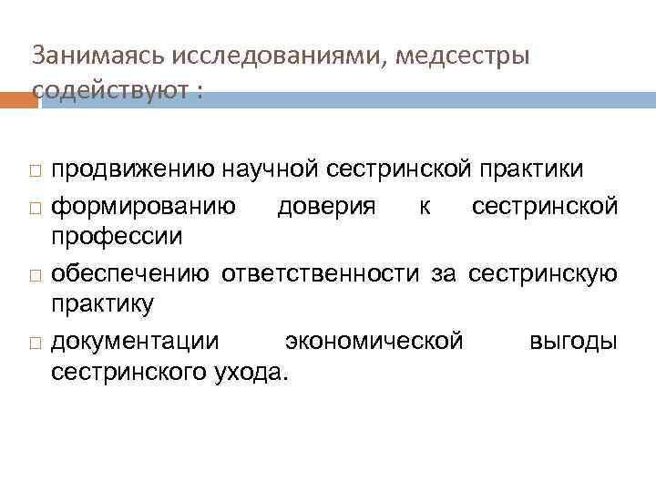 Занимаясь исследованиями, медсестры содействуют : продвижению научной сестринской практики формированию доверия к сестринской профессии обеспечению ответственности за сестринскую практику документации экономической выгоды сестринского ухода.