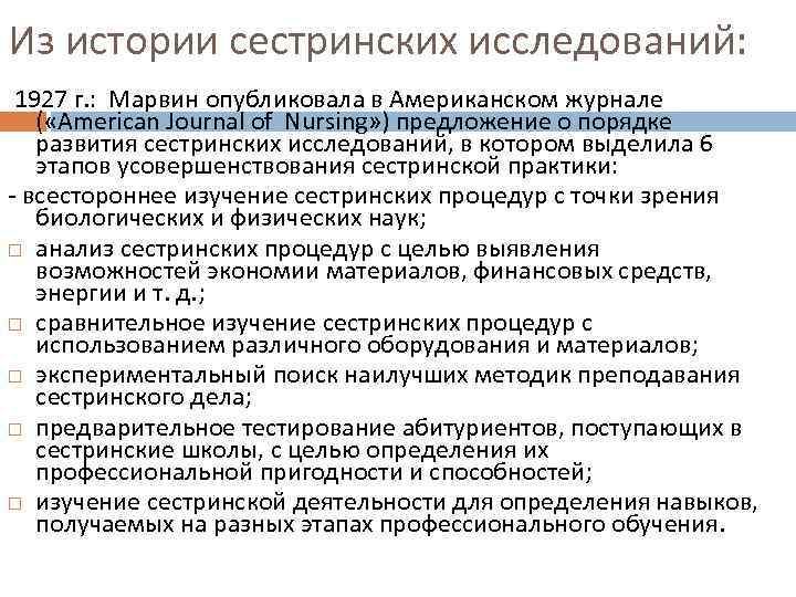 Из истории сестринских исследований: 1927 г. : Марвин опубликовала в Американском журнале ( «American Journal of Nursing» ) предложение о порядке развития сестринских исследований, в котором выделила 6 этапов усовершенствования сестринской практики: - всестороннее изучение сестринских процедур с точки зрения биологических и физических наук; анализ сестринских процедур с целью выявления возможностей экономии материалов, финансовых средств, энергии и т. д. ; сравнительное изучение сестринских процедур с использованием различного оборудования и материалов; экспериментальный поиск наилучших методик преподавания сестринского дела; предварительное тестирование абитуриентов, поступающих в сестринские школы, с целью определения их профессиональной пригодности и способностей; изучение сестринской деятельности для определения навыков, получаемых на разных этапах профессионального обучения.