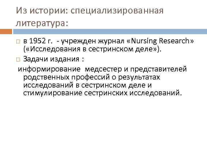 Из истории: специализированная литература: в 1952 г. - учрежден журнал «Nursing Research» ( «Исследования в сестринском деле» ). Задачи издания : информирование медсестер и представителей родственных профессий о результатах исследований в сестринском деле и стимулирование сестринских исследований.