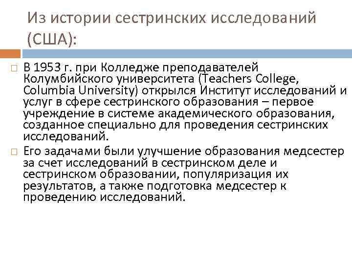 Из истории сестринских исследований (США): В 1953 г. при Колледже преподавателей Колумбийского университета (Teachers College, Columbia University) открылся Институт исследований и услуг в сфере сестринского образования – первое учреждение в системе академического образования, созданное специально для проведения сестринских исследований. Его задачами были улучшение образования медсестер за счет исследований в сестринском деле и сестринском образовании, популяризация их результатов, а также подготовка медсестер к проведению исследований.