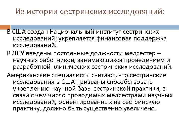Из истории сестринских исследований: В США создан Национальный институт сестринских исследований; укрепляется финансовая поддержка исследований. В ЛПУ введены постоянные должности медсестер – научных работников, занимающихся проведением и разработкой клинических сестринских исследований. Американские специалисты считают, что сестринские исследования в США призваны способствовать укреплению научной базы сестринской практики, в связи с чем число проводимых медсестрами научных исследований, ориентированных на сестринскую практику, должно быть существенно увеличено.