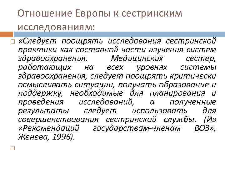 Отношение Европы к сестринским исследованиям: «Следует поощрять исследования сестринской практики как составной части изучения систем здравоохранения. Медицинских сестер, работающих на всех уровнях системы здравоохранения, следует поощрять критически осмысливать ситуации, получать образование и поддержку, необходимые для планирования и проведения исследований, а полученные результаты следует использовать для совершенствования сестринской службы. (Из «Рекомендаций государствам-членам ВОЗ» , Женева, 1996).