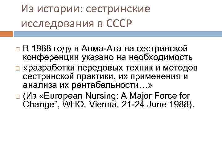 Из истории: сестринские исследования в СССР В 1988 году в Алма-Ата на сестринской конференции указано на необходимость «разработки передовых техник и методов сестринской практики, их применения и анализа их рентабельности…» (Из «European Nursing: A Major Force for Change”, WHO, Vienna, 21 -24 June 1988).