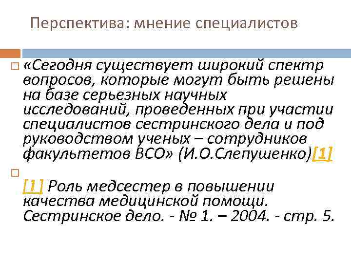 Перспектива: мнение специалистов «Сегодня существует широкий спектр вопросов, которые могут быть решены на базе серьезных научных исследований, проведенных при участии специалистов сестринского дела и под руководством ученых – сотрудников факультетов ВСО» (И. О. Слепушенко)[1] Роль медсестер в повышении качества медицинской помощи. Сестринское дело. - № 1. – 2004. - стр. 5.