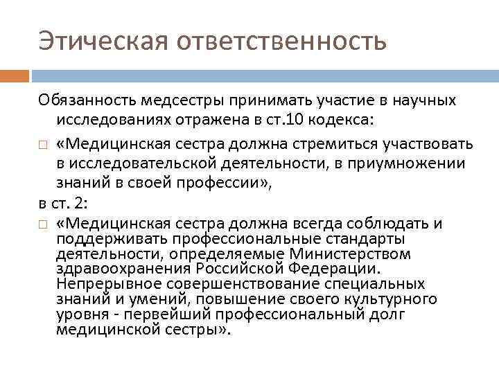 Этическая ответственность Обязанность медсестры принимать участие в научных исследованиях отражена в ст. 10 кодекса: «Медицинская сестра должна стремиться участвовать в исследовательской деятельности, в приумножении знаний в своей профессии» , в ст. 2: «Медицинская сестра должна всегда соблюдать и поддерживать профессиональные стандарты деятельности, определяемые Министерством здравоохранения Российской Федерации. Непрерывное совершенствование специальных знаний и умений, повышение своего культурного уровня - первейший профессиональный долг медицинской сестры» .