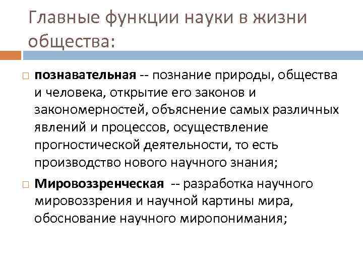 Главные функции науки в жизни общества: познавательная -- познание природы, общества и человека, открытие его законов и закономерностей, объяснение самых различных явлений и процессов, осуществление прогностической деятельности, то есть производство нового научного знания; Мировоззренческая -- разработка научного мировоззрения и научной картины мира, обоснование научного миропонимания;
