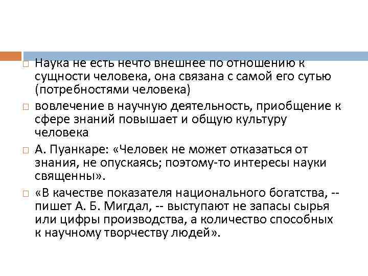 Наука не есть нечто внешнее по отношению к сущности человека, она связана с самой его сутью (потребностями человека) вовлечение в научную деятельность, приобщение к сфере знаний повышает и общую культуру человека А. Пуанкаре: «Человек не может отказаться от знания, не опускаясь; поэтому-то интересы науки священны» . «В качестве показателя национального богатства, -- пишет А. Б. Мигдал, -- выступают не запасы сырья или цифры производства, а количество способных к научному творчеству людей» .