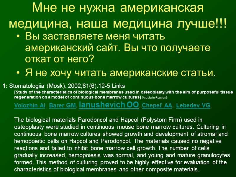 Мне не нужна американская медицина, наша медицина лучше!!! Вы заставляете меня читать американский сайт. Вы что получаете откат от него? Я не хочу читать американские статьи. 1: Stomatologiia (Mosk). 2002;81(6):12-5.Links [Study of the characteristics of biological membranes used in osteoplasty with the aim of purposeful tissue regeneration on a model of continuous bone marrow cultures] [Article in Russian] Volozhin AI, Barer GM, Ianushevich OO, Chepel' AA, Lebedev VG. The biological materials Parodoncol and Hapcol (Polystom Firm) used in osteoplasty were studied in continuous mouse bone marrow cultures. Culturing in continuous bone marrow cultures showed growth and development of stromal and hemopoietic cells on Hapcol and Parodoncol. The materials caused no negative reactions and failed to inhibit bone marrow cell growth. The number of cells gradually increased, hemopoiesis was normal, and young and mature granulocytes formed. This method of culturing proved to be highly effective for evaluation of the characteristics of biological membranes and other composite materials.