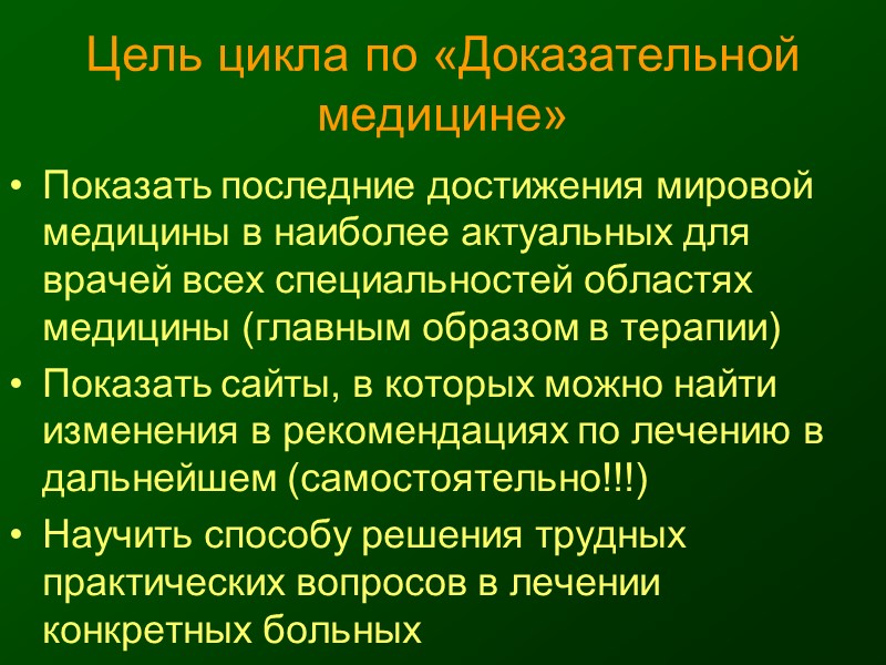 Цель цикла по «Доказательной медицине» Показать последние достижения мировой медицины в наиболее актуальных для врачей всех специальностей областях медицины (главным образом в терапии) Показать сайты, в которых можно найти изменения в рекомендациях по лечению в дальнейшем (самостоятельно!!!) Научить способу решения трудных практических вопросов в лечении конкретных больных