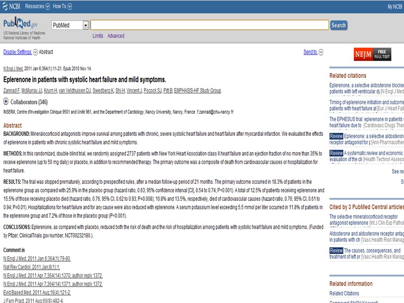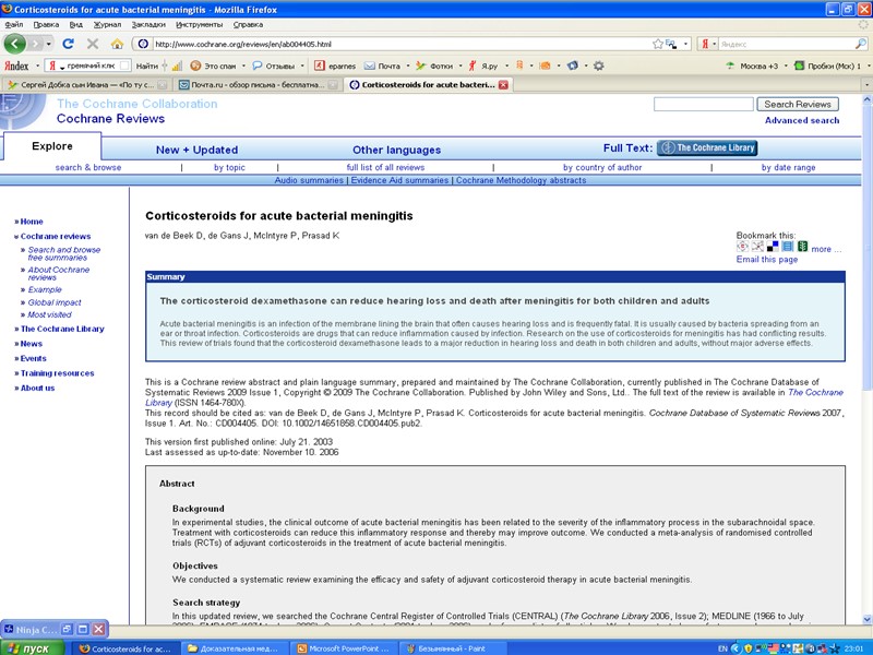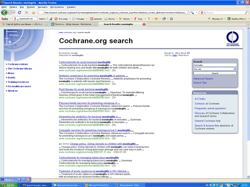 http://www.ncbi.nlm.nih.gov/sites/ - pubmed - статьи по всем проблемам медицины. Поиск по ключевым словам на английском языке http://www.cochrane.org/index_ru.htm - кохрановское сотрудничество. Метаанализы и обзоры по всем проблемам медицины, основанные на исследованиях, соответствующих GCP. рекомендуемые сайты