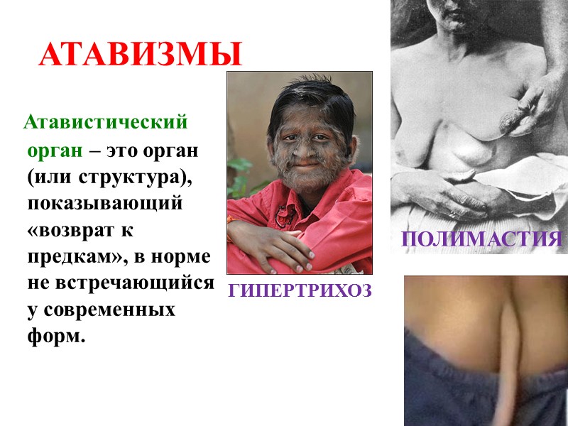 АТАВИЗМЫ Атавистический орган – это орган (или структура), показывающий «возврат к предкам», в норме не встречающийся у современных форм. ГИПЕРТРИХОЗ ПОЛИМАСТИЯ