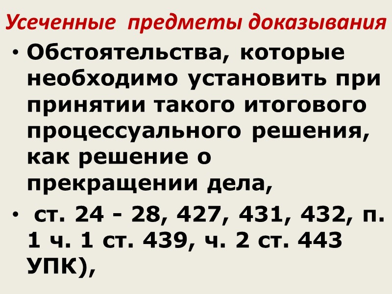Усеченные предметы доказывания Обстоятельства, которые необходимо установить при принятии такого итогового процессуального решения, как решение о прекращении дела, ст. 24 - 28, 427, 431, 432, п. 1 ч. 1 ст. 439, ч. 2 ст. 443 УПК),