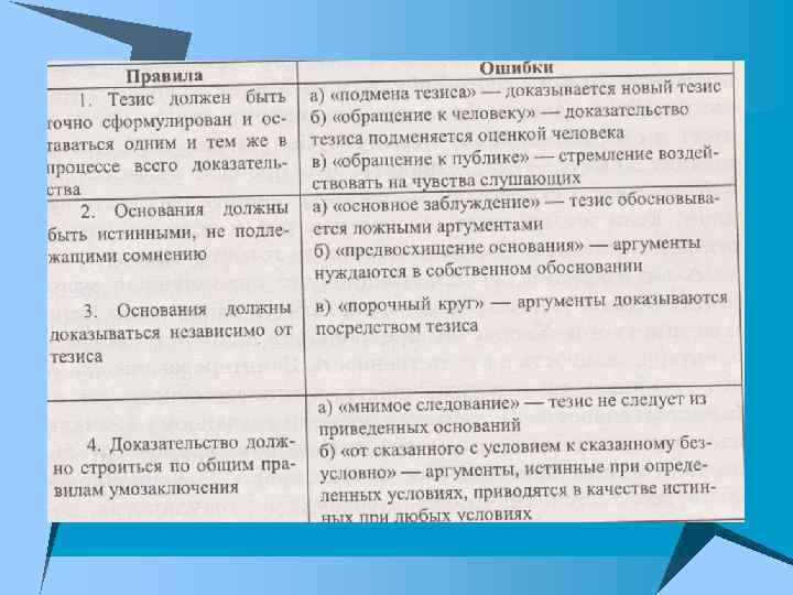 Правила аргументов (оснований): 1. Аргументы должны быть положениями истинными. 2. Истинность аргументов должна быть независимой от тезиса. 3. Аргументы должны являться достаточным основанием для тезиса, должны с необходимостью обосновывать тезис; тезис из аргументов должен следовать по законам логики, с необходимостью.