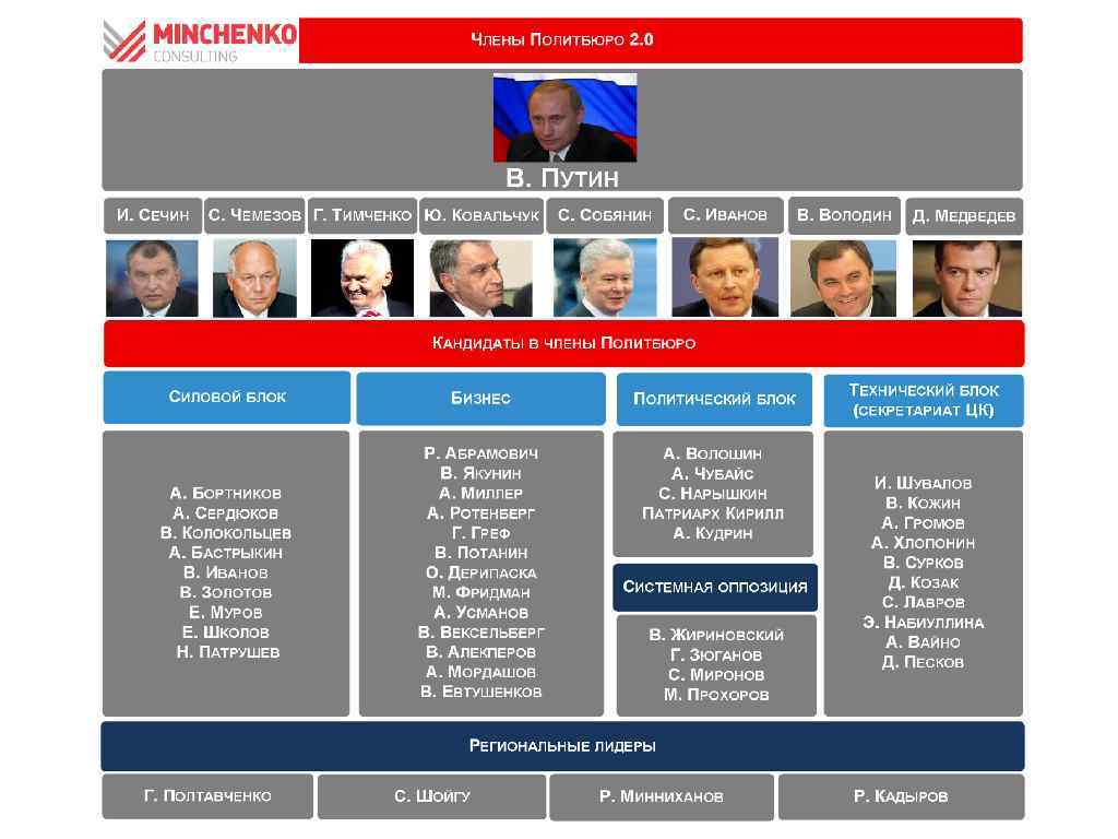 Новое Политбюро Правящая элита России может быть описана в модели советского коллективного властного органа Политбюро ЦК КПСС Специфика Политбюро 2. 0 Никогда не собирается на общие совещания Формальный статус не всегда соотносится с реальным влиянием на процесс принятия решений Несколько кругов: «силовой» , «политический» , «технический» и «предпринимательский» , - соперничают за влияние на Политбюро 2. 0 и «выдвигают» своих кандидатов на вхождение в него Вместе с административными кланами они образуют аналог ЦК КПСС