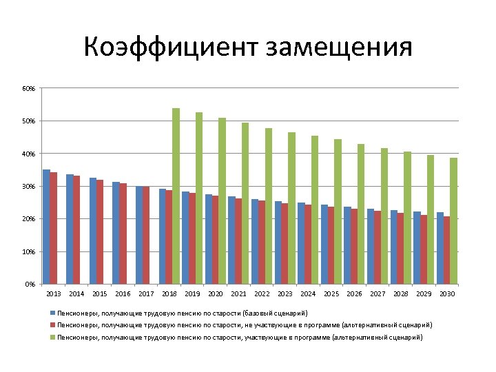 Коэффициент замещения 60% 50% 40% 30% 20% 10% 0% 2013 2014 2015 2016 2017 2018 2019 2020 2021 2022 2023 2024 2025 2026 2027 2028 2029 Пенсионеры, получающие трудовую пенсию по старости (базовый сценарий) Пенсионеры, получающие трудовую пенсию по старости, не участвующие в программе (альтернативный сценарий) Пенсионеры, получающие трудовую пенсию по старости, участвующие в программе (альтернативный сценарий) 2030