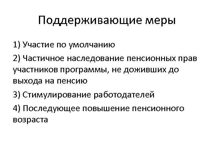 Поддерживающие меры 1) Участие по умолчанию 2) Частичное наследование пенсионных прав участников программы, не доживших до выхода на пенсию 3) Стимулирование работодателей 4) Последующее повышение пенсионного возраста