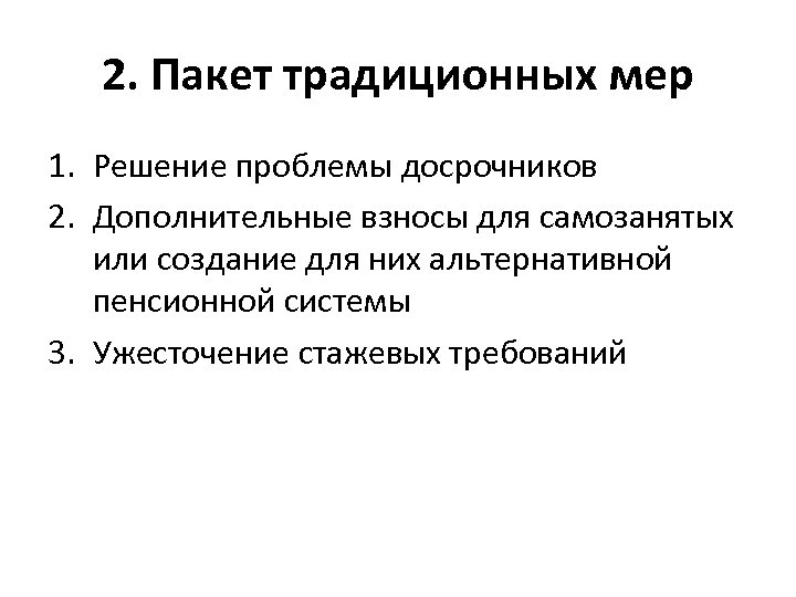 2. Пакет традиционных мер 1. Решение проблемы досрочников 2. Дополнительные взносы для самозанятых или создание для них альтернативной пенсионной системы 3. Ужесточение стажевых требований