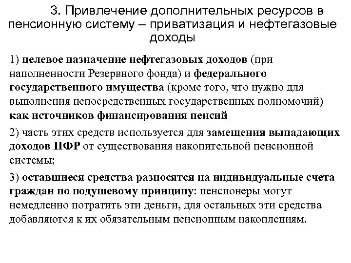 3. Привлечение дополнительных ресурсов в пенсионную систему – приватизация и нефтегазовые доходы 1) целевое назначение нефтегазовых доходов (при наполненности Резервного фонда) и федерального государственного имущества (кроме того, что нужно для выполнения непосредственных государственных полномочий) как источников финансирования пенсий 2) часть этих средств используется для замещения выпадающих доходов ПФР от существования накопительной пенсионной системы; 3) оставшиеся средства разносятся на индивидуальные счета граждан по подушевому принципу: пенсионеры могут немедленно потратить эти деньги, для остальных эти средства добавляются к их обязательным пенсионным накоплениям.