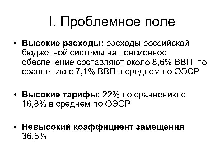 I. Проблемное поле • Высокие расходы: расходы российской бюджетной системы на пенсионное обеспечение составляют около 8, 6% ВВП по сравнению с 7, 1% ВВП в среднем по ОЭСР • Высокие тарифы: 22% по сравнению с 16, 8% в среднем по ОЭСР • Невысокий коэффициент замещения 36, 5%