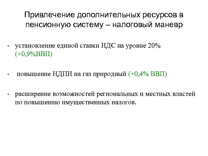 Привлечение дополнительных ресурсов в пенсионную систему – налоговый маневр - установление единой ставки НДС на уровне 20% (+0, 9%ВВП) - повышение НДПИ на газ природный (+0, 4% ВВП) - расширение возможностей региональных и местных властей по повышению имущественных налогов.
